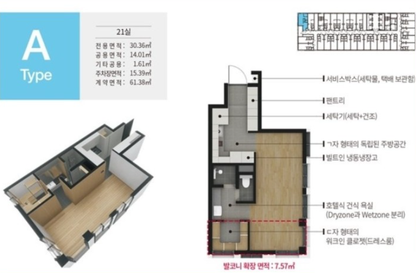 전용면적 7평~11.45평까지 다양하게 있으며, 타입별로 면적이 약간 다르기 때문에 분양가격도 다릅니다