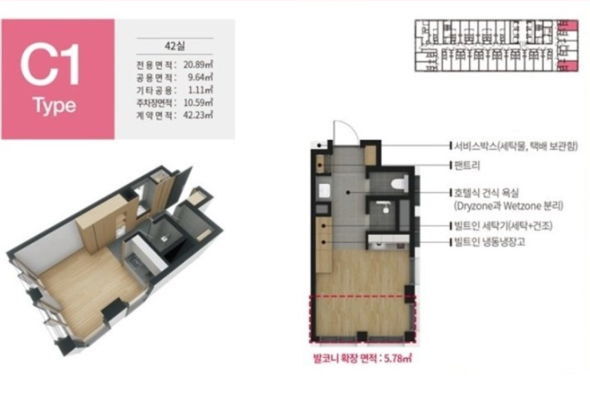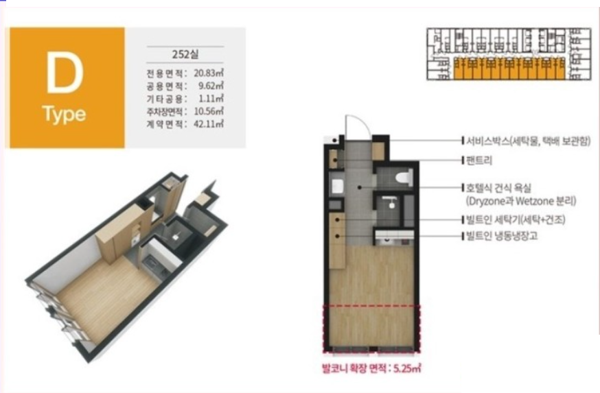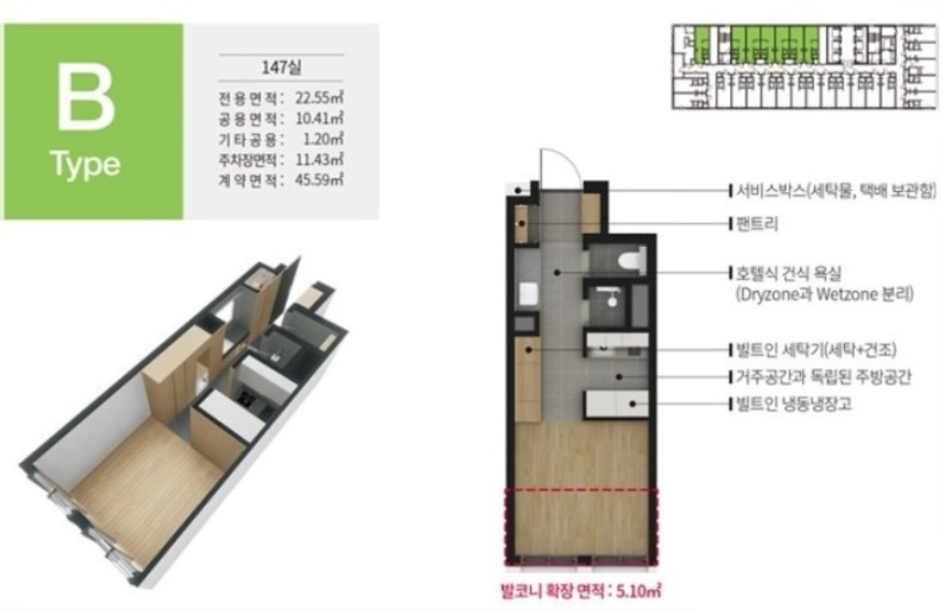 전용면적 7평~11.45평까지 다양하게 있으며, 타입별로 면적이 약간 다르기 때문에 분양가격도 다릅니다