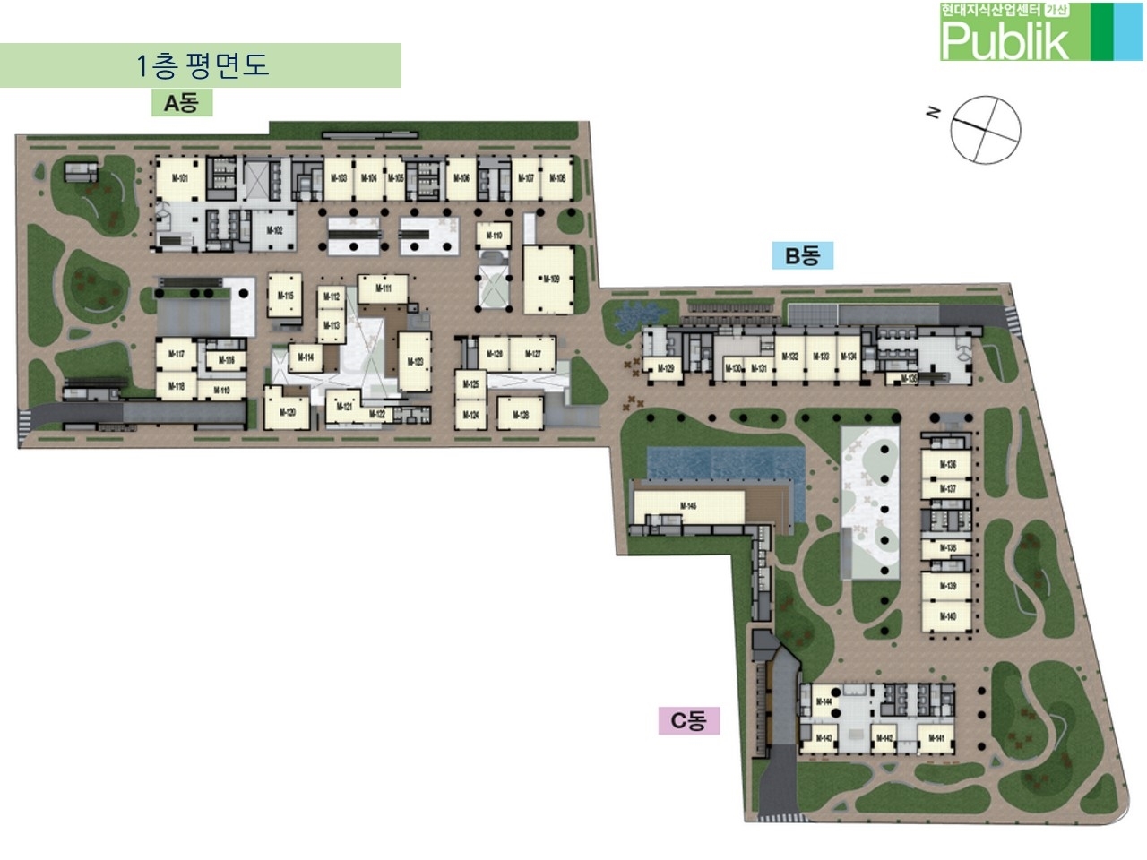 지식산업센터 (A동)과 지식산업센터 (B동), 기숙사 (C동) 3개 동으로 나누어져 있습니다