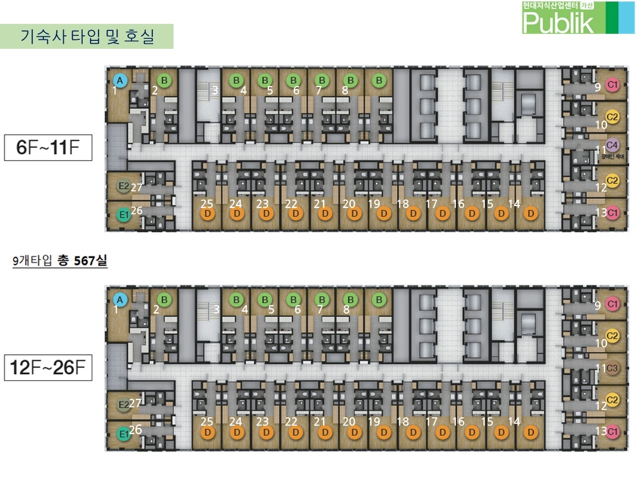 b동 20층까지는 지원시설(근생), 지식산업센터이고, c동 4층~5층은 지원시설, 6층~26층까지는 기숙사로 구성되었습니다.