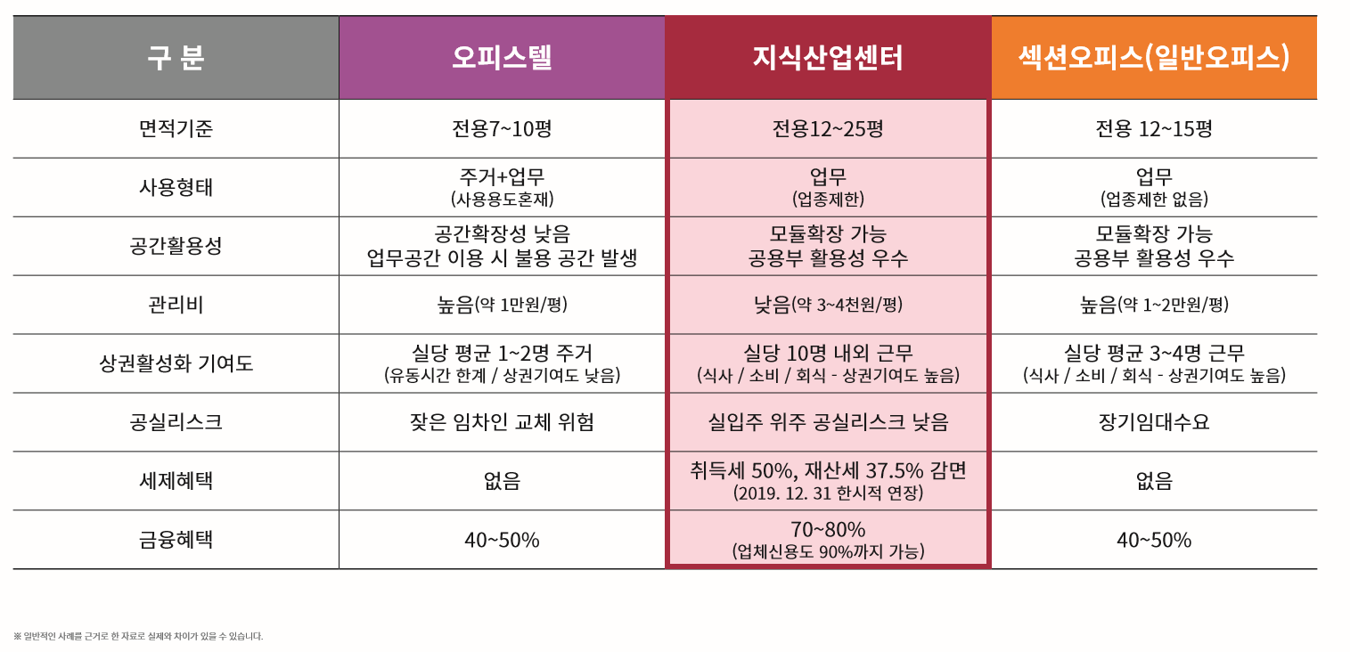 지식산업센터는 분양받으시면, 5년간 사용하시는 조건으로 취득세 50% 감면(2023년까지)과 재산세 37.5% 감면 혜택이 있습니다. 기업체 위주로 장기임대가 가능하고, 전매 제한이 없으며, 저렴한 관리비(평당 3~4천 원), 편리한 주차공간과 풍부한 녹지공간으로 사용하시기에 매우 편리합니다.