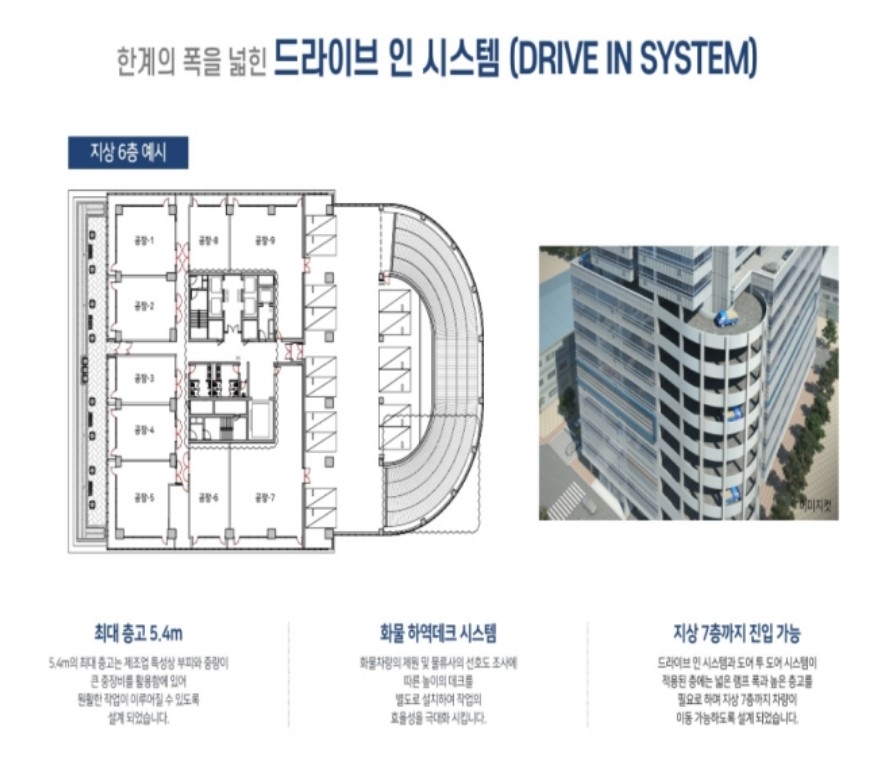 드라이브인 시스템과 도어투도어 시스템이 적용된 층에는 넓은 램프 폭과 높은 층고를 필요로 하여 지상7층까지 차량이 이동 가능하도록 설계되었습니다.
