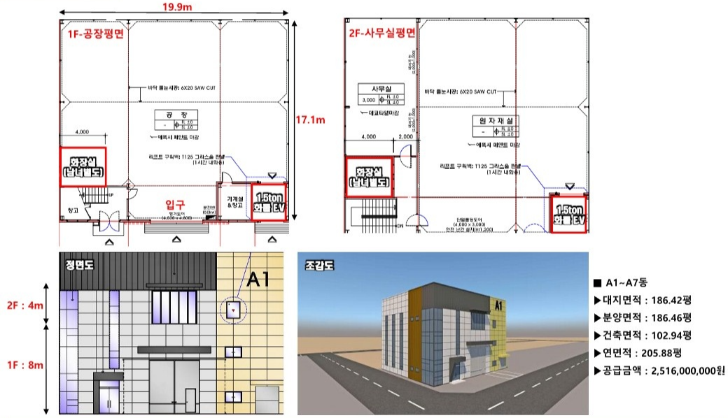 중소형 단독공장으로 1층 제조공장, 2층 사무실이나 창고로 사용 가능하며 남녀화장실이 설치되어 있습니다.