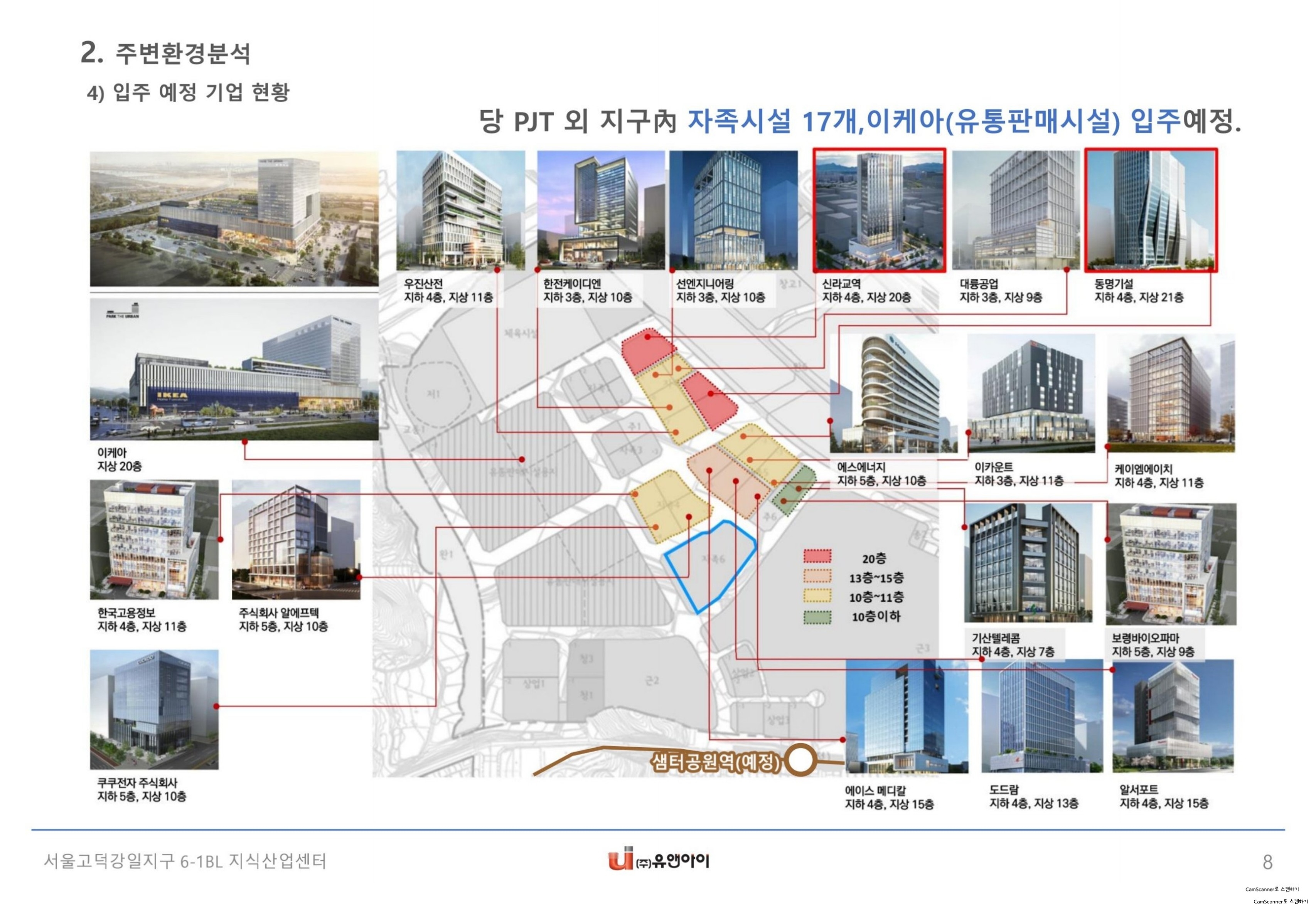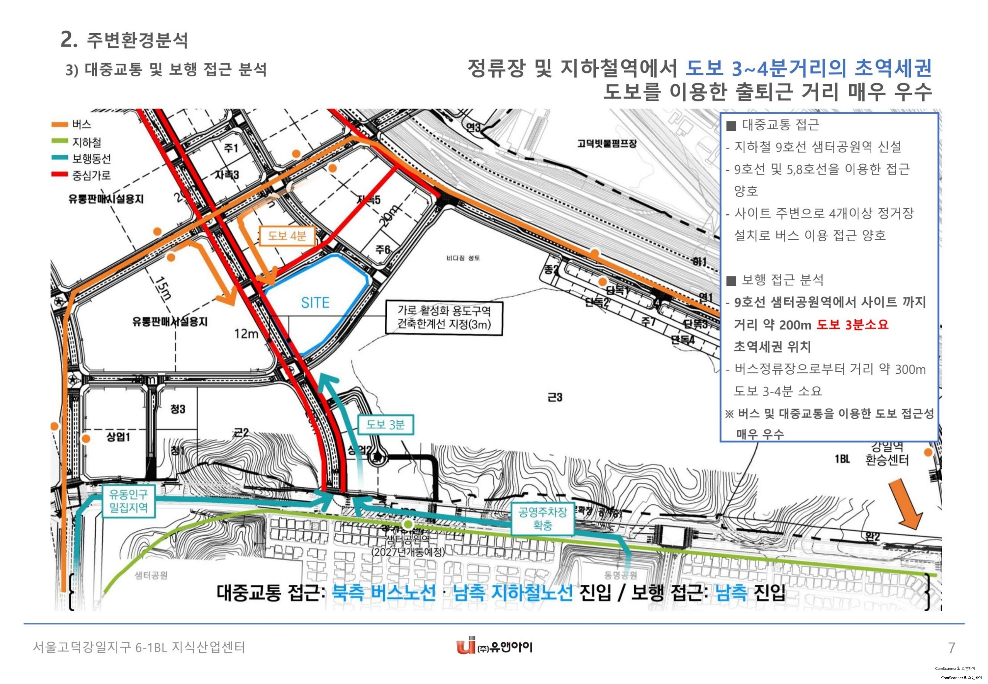 - 고덕밸리 안에 유일한 지식산업센 이며, 초입에 위치하여 노출성이 우수합니다. 9호선 샘터공원 역에서 강동u1센터까지 도보 약 200m 정도 입니다. (시설확정, 지하철 5.8호선 연장, 강일역 내 환승센터 설치 예정임)
