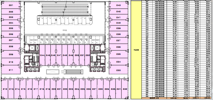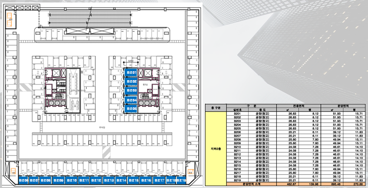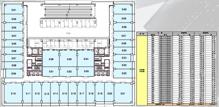 연면적 3만 평인 광명하안테라타워 도면입니다. 지하 2층~지하 5층 주차장과 6평부터~17평의 창고로 구성되어 있네요