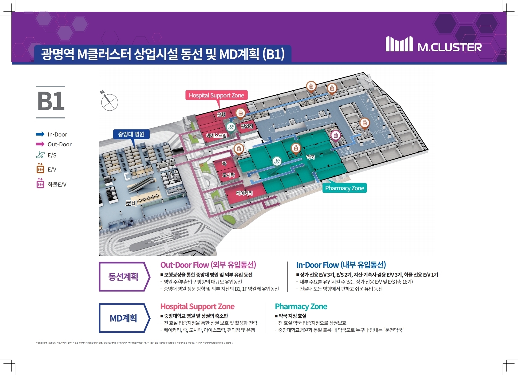 중앙대병원, 보행광장, 공원 등으로 유동인구가 풍부한 상가(지상1층)와 메디컬관련 특화아이템 MD가 있는 상가(지상2층) 지식산업센터, 기숙사 등 상주인구의 쉼터, 6층의 정원과 연계된 상가 입니다.