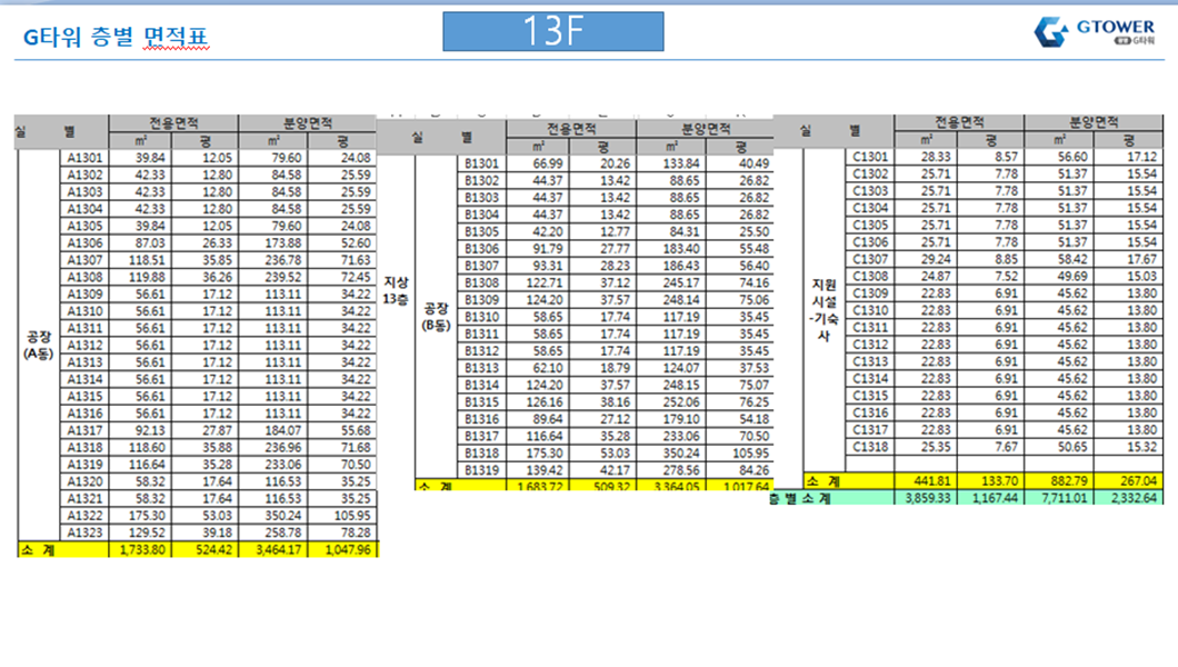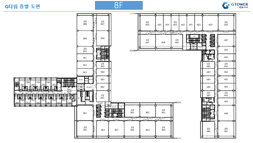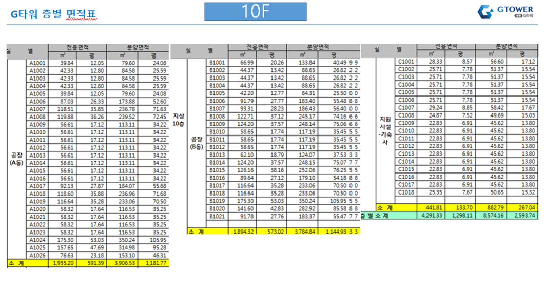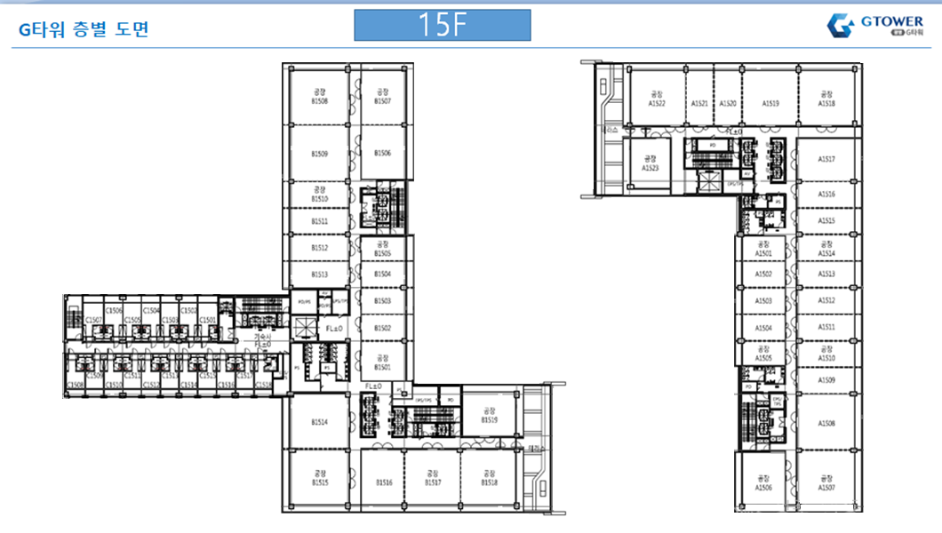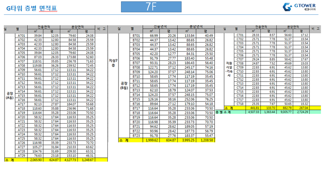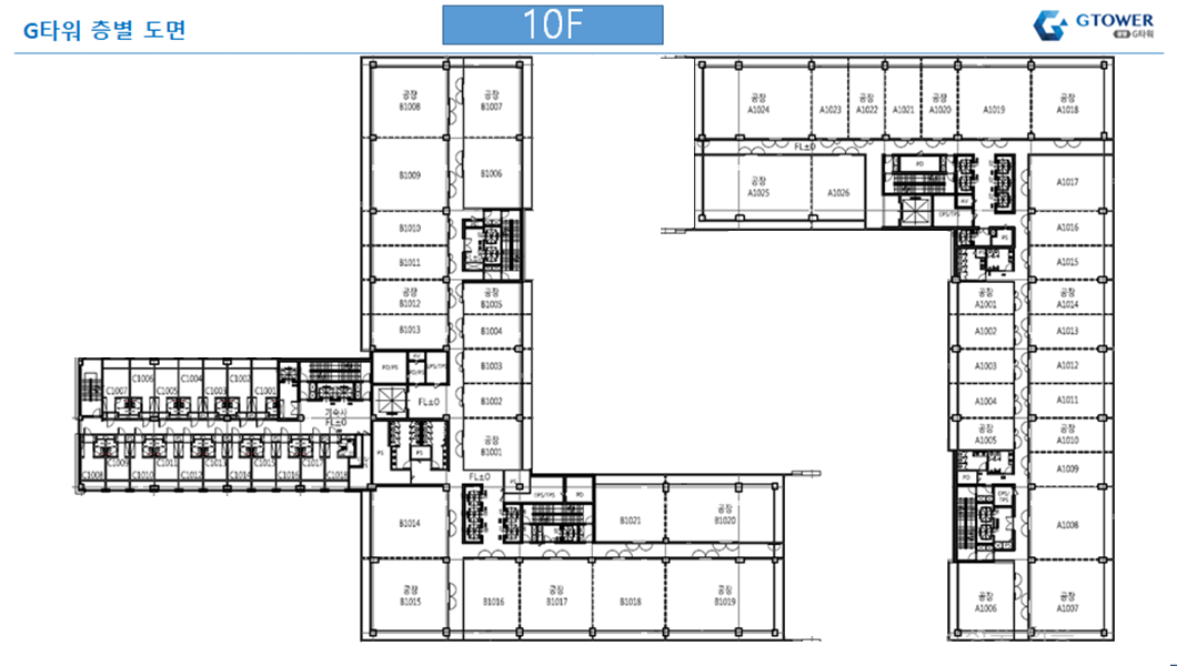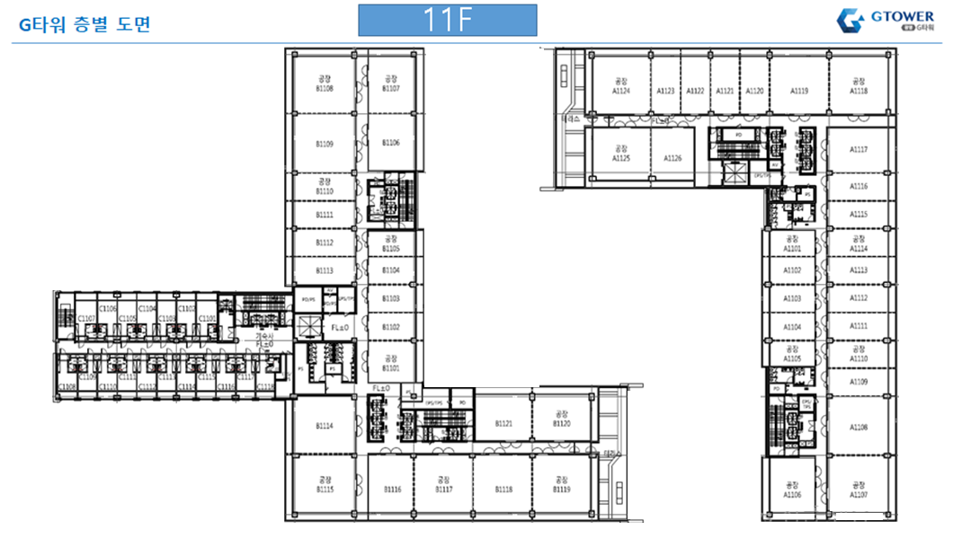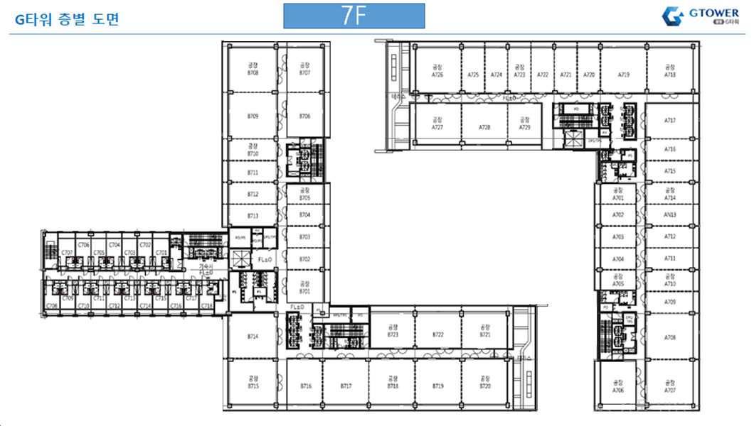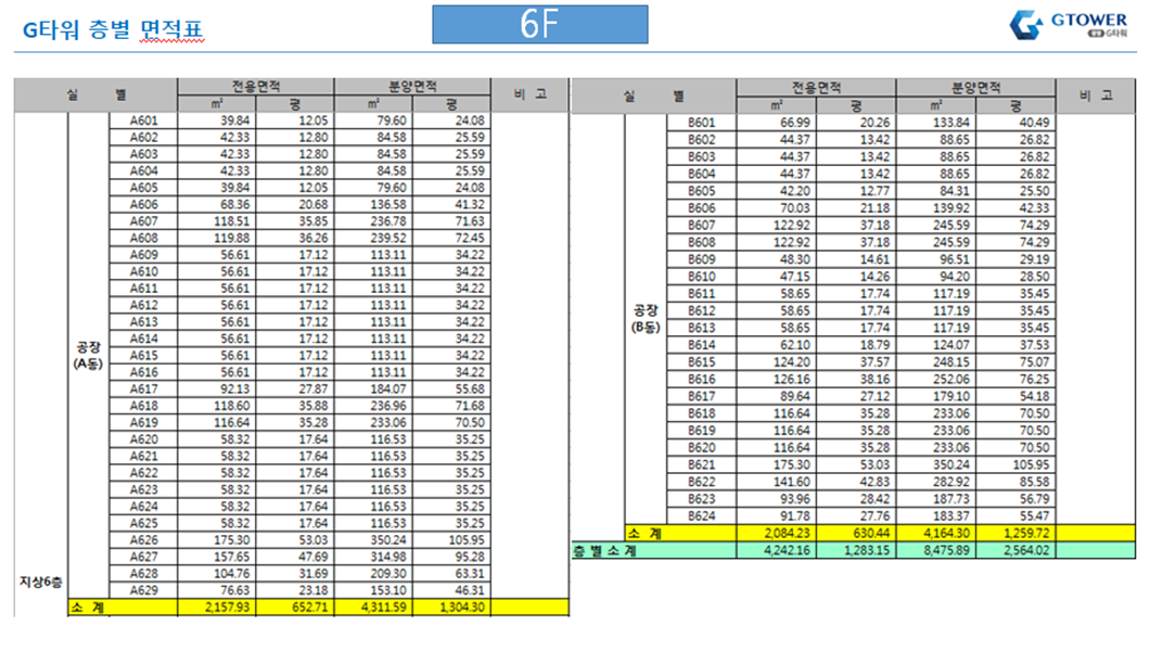 6층에서부터 공장 A동, B동으로 나누어져 있으며, 마찬가지로 다양한 평수의 공장(오피스)가 있습니다.