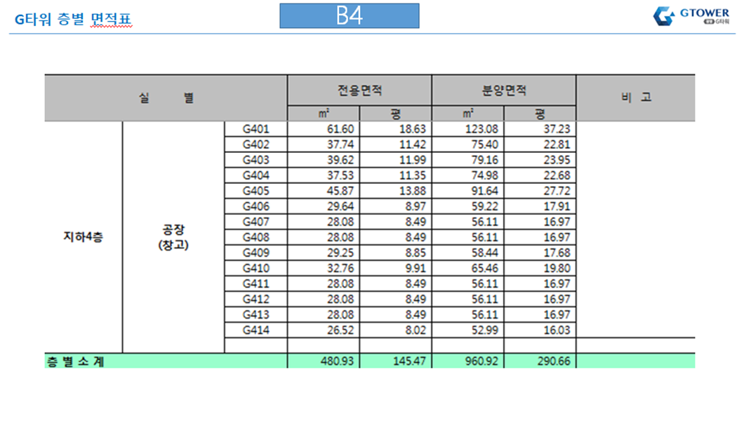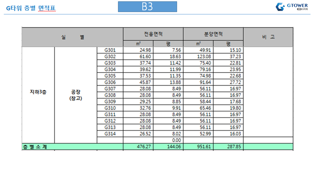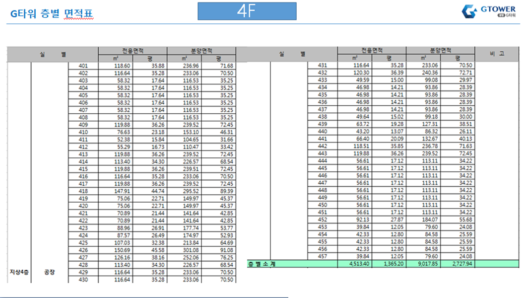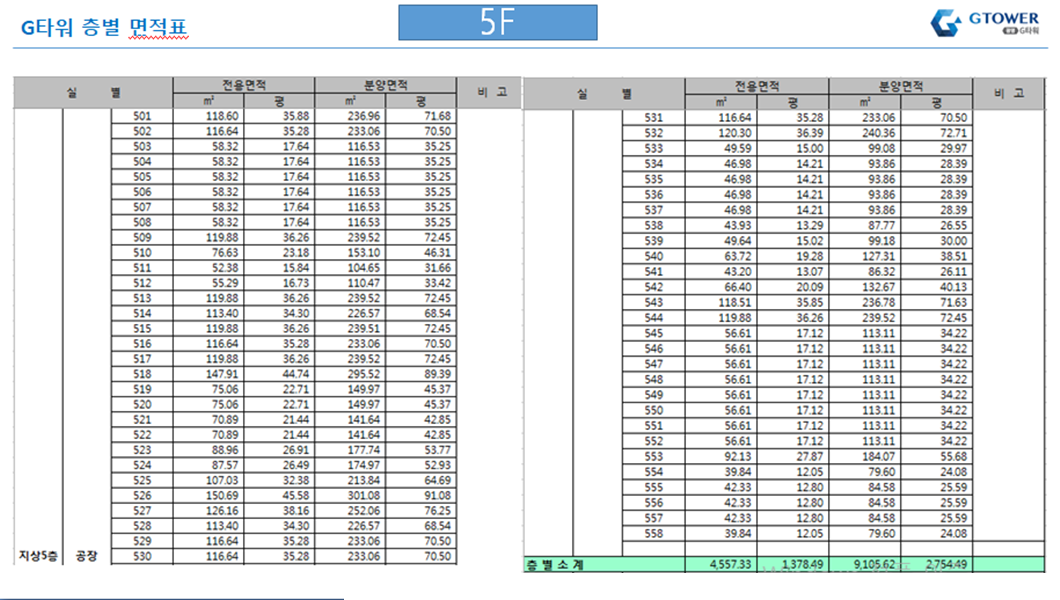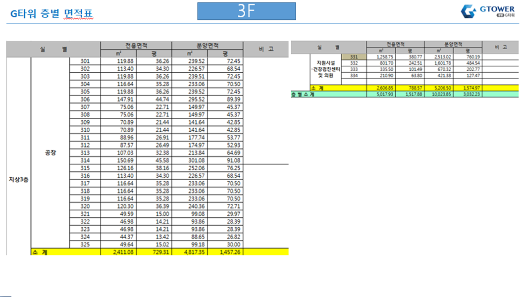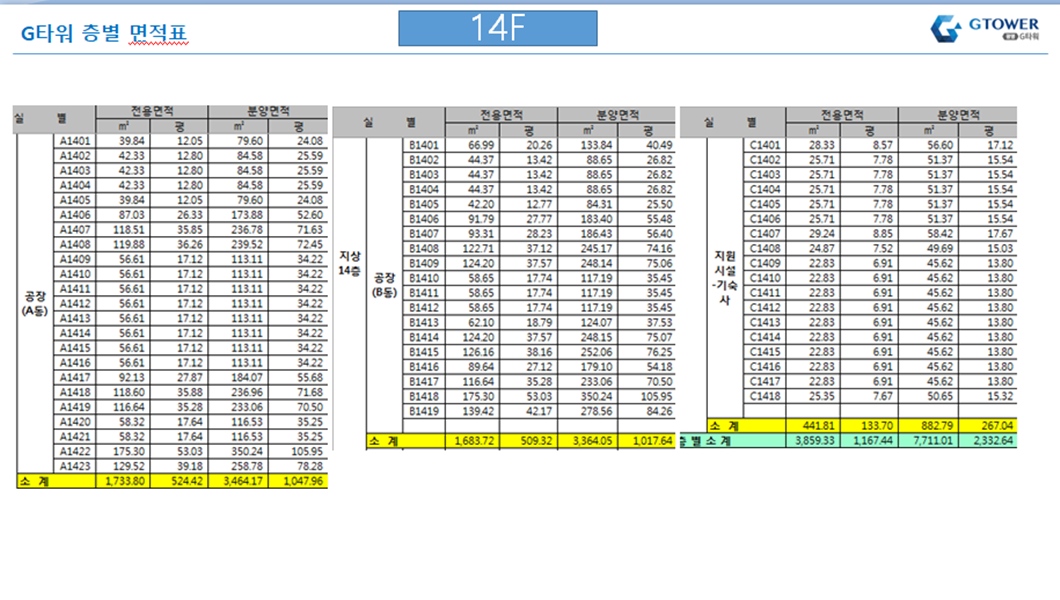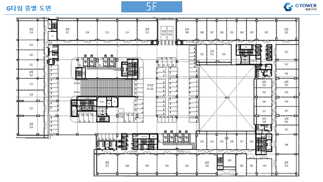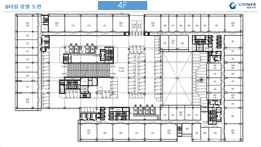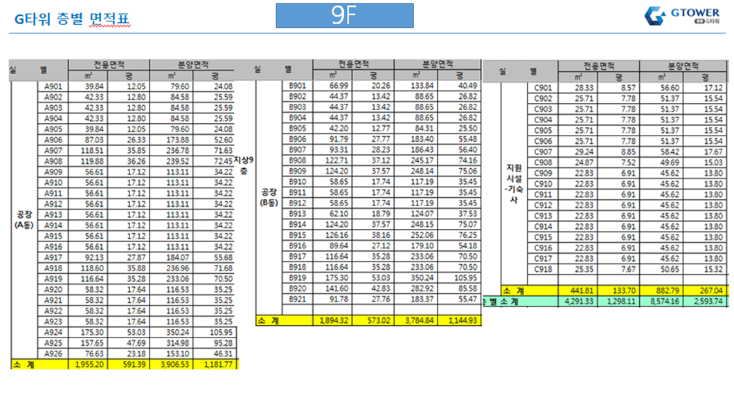 6층에서부터 공장 A동, B동으로 나누어져 있으며, 마찬가지로 다양한 평수의 공장(오피스)가 있습니다.