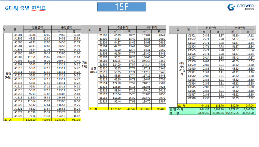 7층~15층까지는 A동 공장 29개 호실, B동 공장 23개 호실 기숙사 18개 호실로 구성되었으며, 기숙사는 전용 6.91평~8.57평 수입니다. 그리고 냉장고, 에어컨, 세탁기 등등 기본 옵션이 준비되어 있습니다. 일반 오피스텔과 다른 점은 약 1.3평 정도의 발코니가 있다는 점이고, 관리비가 훨씬 저렴하다는 장점이 있습니다.