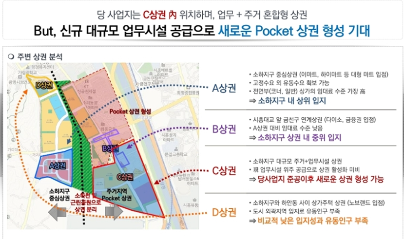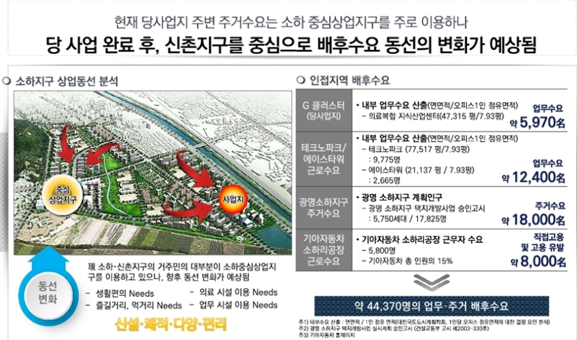 그리고 소하지구 주거 단지로 소하휴먼시아 1단지부터 7단지, 신촌휴먼시아 1,2단지, 휴먼 포레스트 1차 등등 많은 아파트 단지와 소하초, 중, 고부 터 기아차 소하공장, 에이스광명타워, SK 테크노파크 등 주변 배후수요가 약 10만여 명 예상하며 앞으로 구름산지구 개발도 예정되어 있으니 기대해볼 만할듯합니다. 그런 면에서 4만 7천 평의 큰 규모의 광명G타워 지식산업센터! 분양 소식은 소하지구에서 반가운 소식이 아닐까 생각됩니다. 지하에서부터 지상까지 문화시설과 의료시설로 새로운 상권이 형성되리라 봅니다.