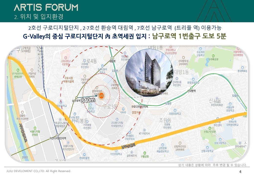 2호선 구로디지털단지, 2.7호선 대림역, 7호선 남구로역 1번출구 도보 5분거리에 위치하였습니다.