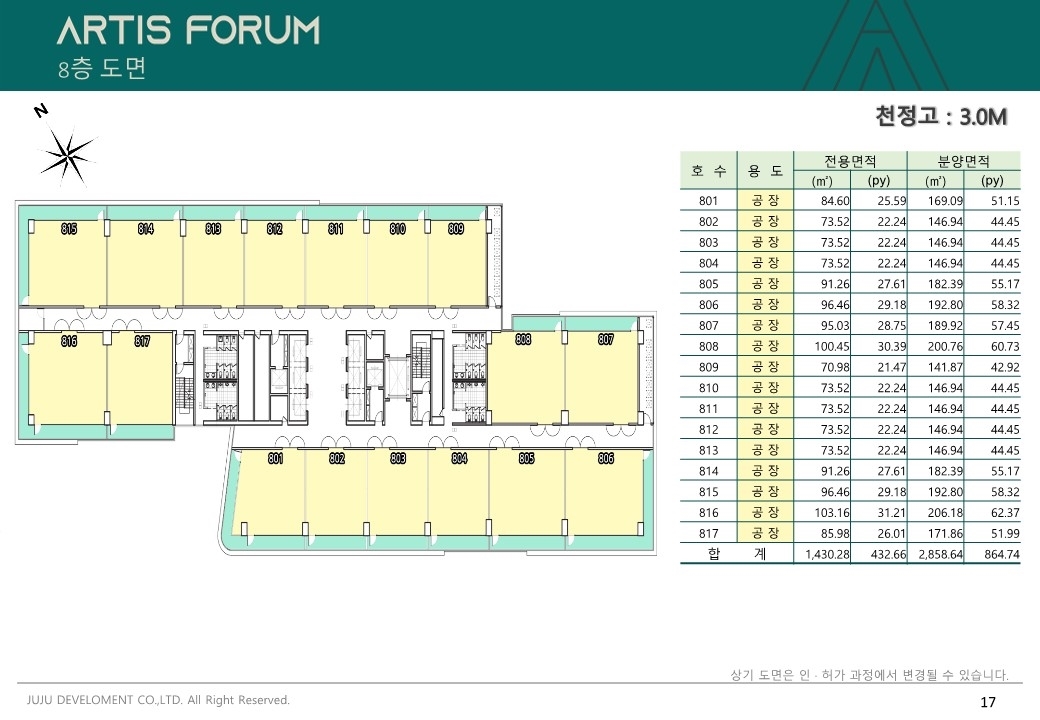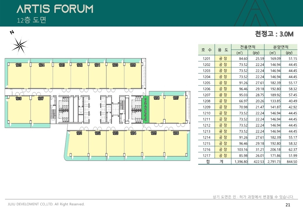 한개층은 17개의 호실로 전용평수 422.54평이고, 분양평수로는 844.11평입니다