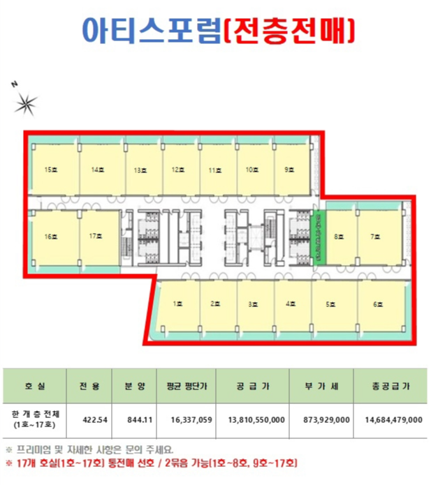 1호~17호실 한개층으로 전매, 1호~8호, 9호~17호 전매 가능합니다