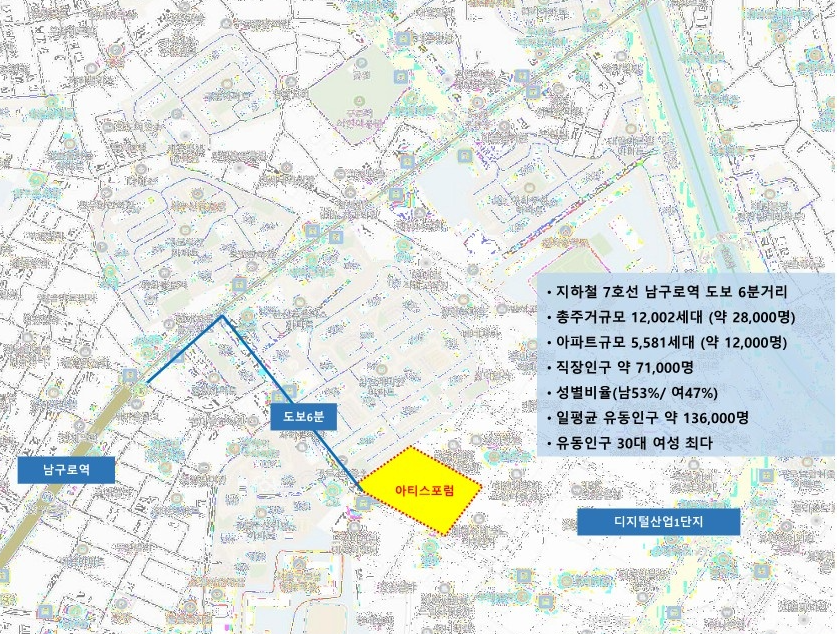 아티스포럼 지하철 7호선 남구로역 도보 6분 거리에 위치하였습니다.