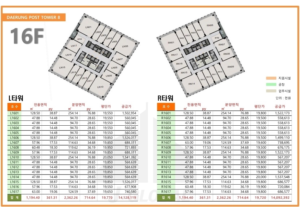 대륭포스트타워8차는 L타워와 R타워로 2개 동입니다