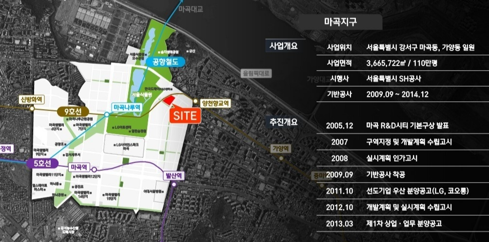마곡지구는 첨단산업 클러스터를 조성하고 업무단지, 배후 주거단지 등 종합개발로 형성