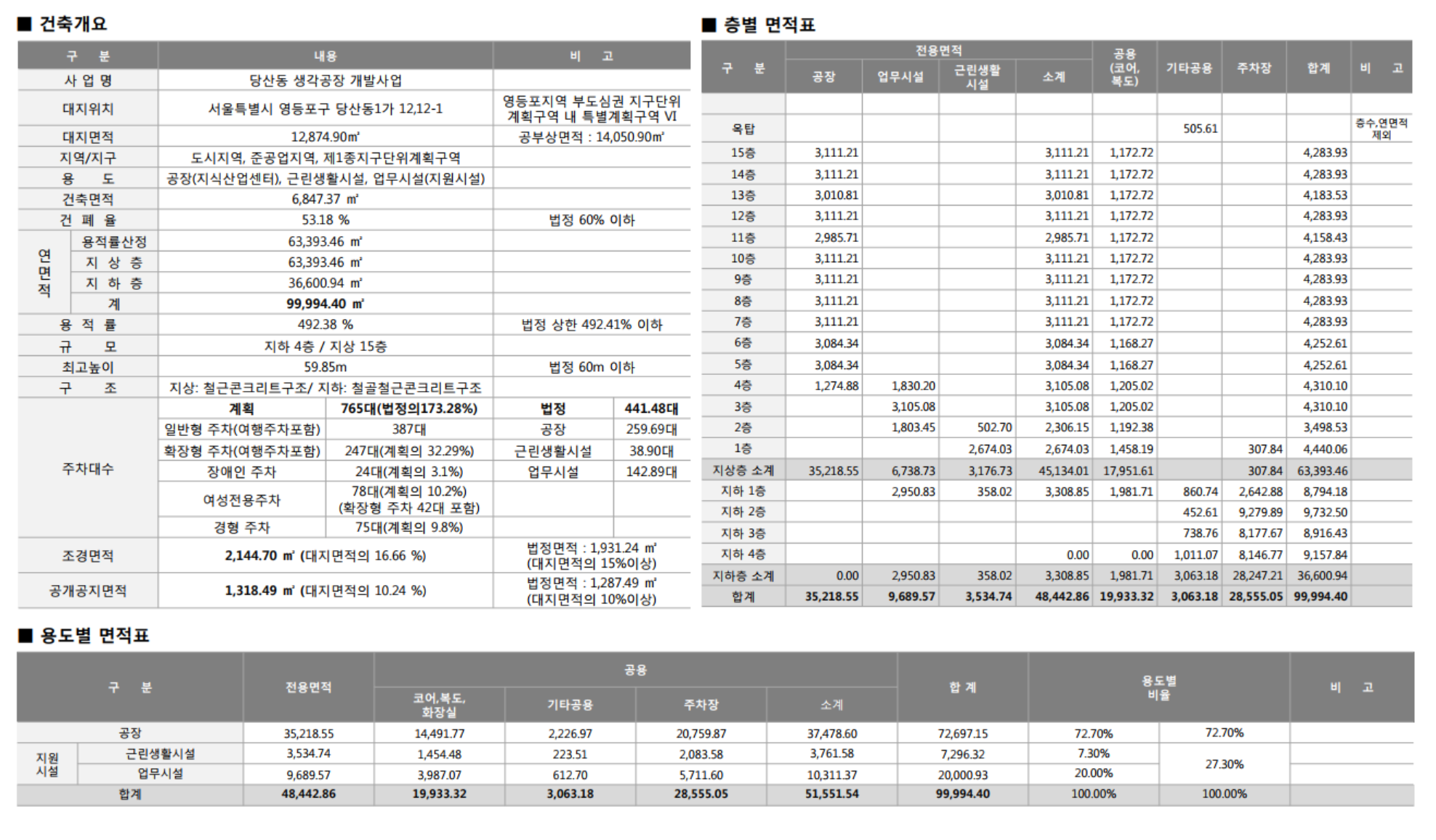 연면적은 99,994.40㎡ (30,248.31평), 지하 4층부터 지상 15층까지 A, B, C 세 개의 동으로 구성되며 연면적 3만여 평의 규모로 공급되니 영등포 지역에서 이만한 지식산업센터는 본 적이 없는듯합니다.