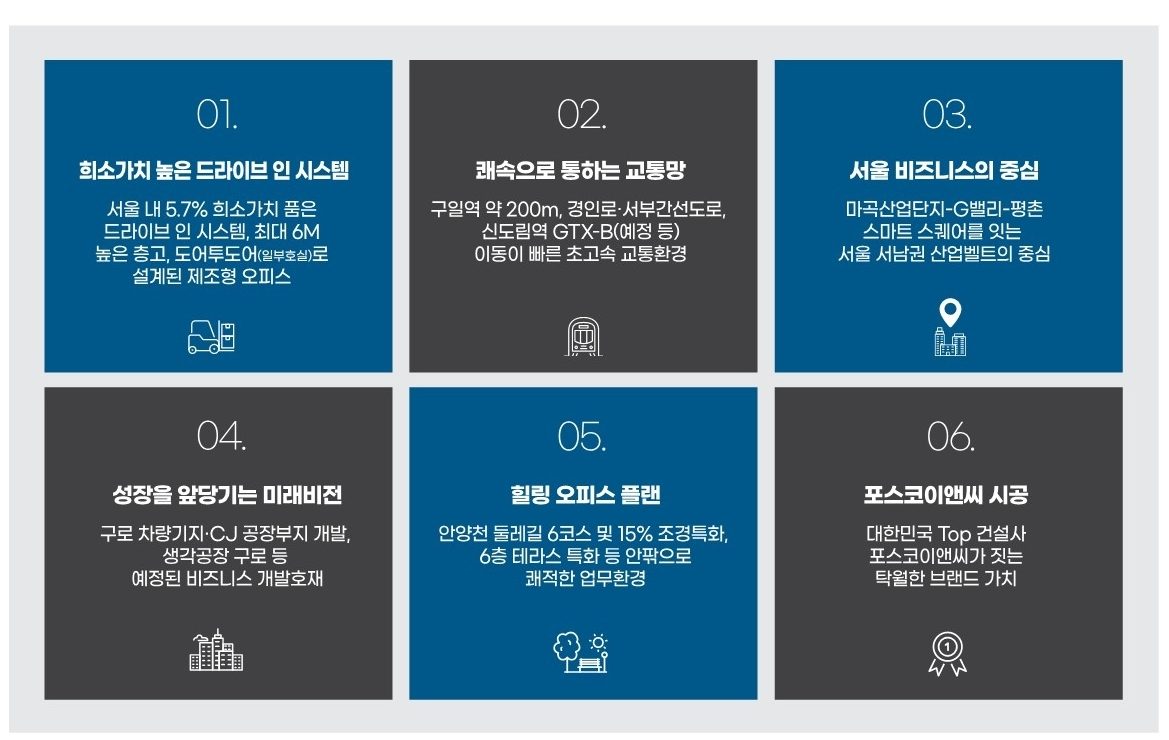 지역 랜드마크인 고척스카이돔이 지근거리에 있고, 현대백화점 디큐브시티점, NC백화점 신구로점 등 대형 쇼핑시설이 가까우며, 안양천, 신구로유수지 생태공원 등도 인접해 쾌적한 업무환경이 구현됩니다. 또한 인근으로 대규모 주거타운이 이미 조성되어 있어, 코스트코, 아이파크몰 등 각종 생활편의시설도 함께 이용할 수 있습니다.