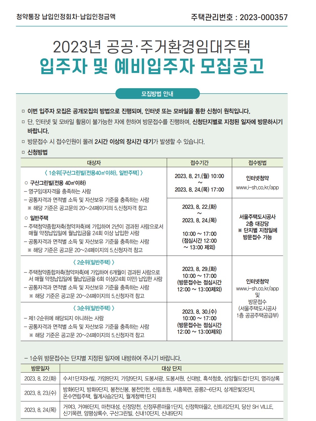 1순위 방문접수는 단지별 지정된 일자에 내방하니, 방문일자와 대상 단지를 아래 내용을 잘 참고하시면 되겠습니다